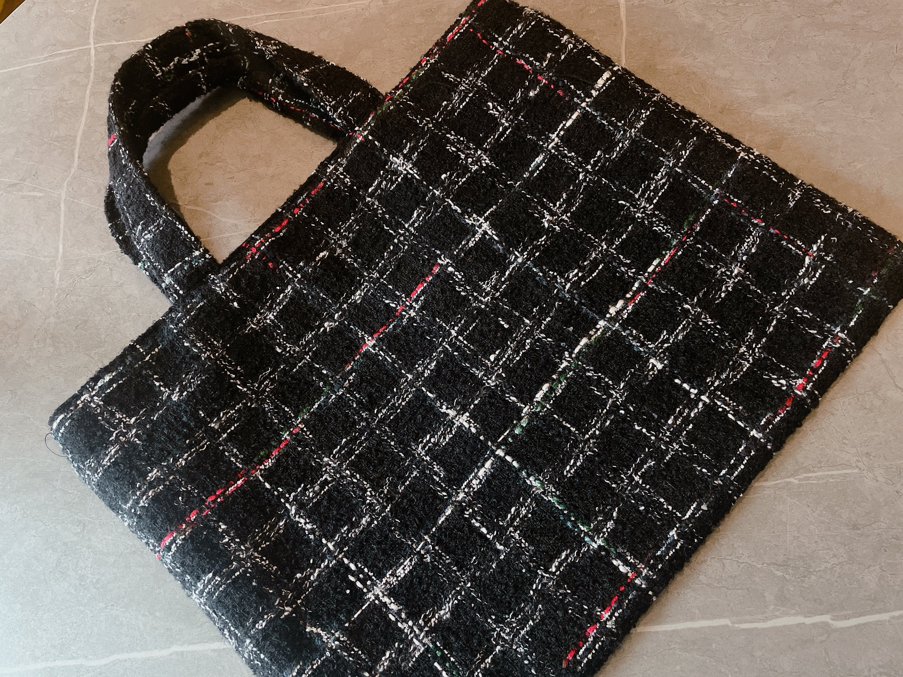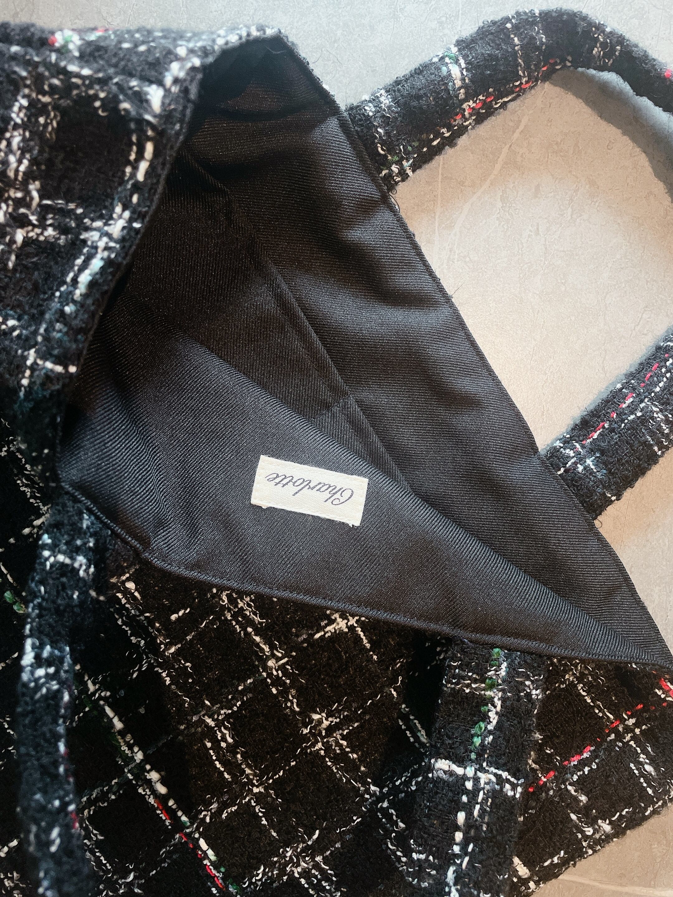 ブラックツイードにレッド、ホワイト、グリーンの糸を混ぜ主張しすぎないデザインとなったおります。